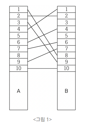 예를 들어, <그림 1>과 같이 전깃줄이 연결되어 있는 경우 A의 1번 위치와 B의 8번 위치를 잇는 전깃줄, A의 3번 위치와 B의 9번 위치를 잇는 전깃줄, A의 4번 위치와 B의 1번 위치를 잇는 전깃줄을 없애면 남아있는 모든 전깃줄이 서로 교차하지 않게 된다.