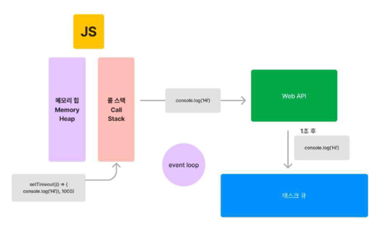 - 코드 중 비동기 함수, 즉 setTimeout 또는 setInterval, 이벤트 핸들러와 같은 Web API 함수를 만나면 자바스크립트 엔진이 이들을 Web API로 보낸다.