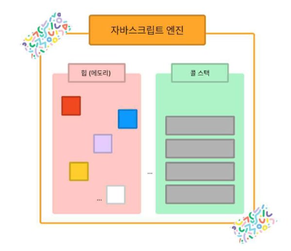 자바스크립트 엔진은 크게 메모리 힙과 콜 스택으로 나눌 수 있다. 이벤트 루프, 콜백 큐와 같은 엔진 외부 요소들과 함께 코드를 실행한다.