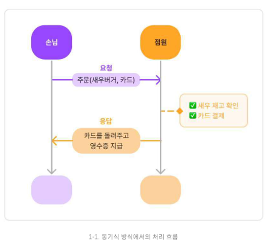 이 일련의 과정 중에서 동기식 프로그램의 특징을 알 수 있다. 손님이 주문을 요청하면, 점원은 그 요청에 대한 처리를 거처 응답을 내놓는다. 손님은 응답이 돌아오기까지 카운터를 떠나지 않고 기다린 뒤, 응답을 받고 나서야 다음 행동을 할 수 있다.
