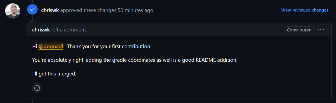 아주 하찮은 수정사항이지만 해당 수정사항을 반영해야 하는 이유에 대해서 정성스레 PR을 올렸고, PR을 올린지 두시간만에 리뷰어님이 Approve와 함께 Merge를 진행해주셨다.