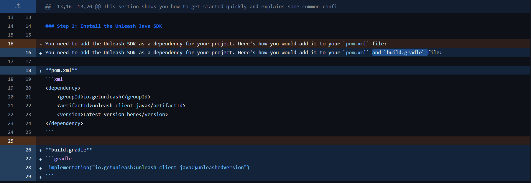 해당 서비스는 피쳐 플래깅 서비스의 Java측 SDK로, ReadMe에 해당 서비스를 사용하기 위한 설정들이 적혀 있었는데, Maven 프로젝트 기준으로 세팅하는 방법이 적혀 있었다. 나는 평소 Gradle로만 프로젝트를 진행했었고, 많은 주니어 개발자들이 비슷한 경험을 했을것이라고 생각했다. 따라서, Gradle로 SDK 의존성을 추가하는 간단한 ReadMe를 작성했다.
