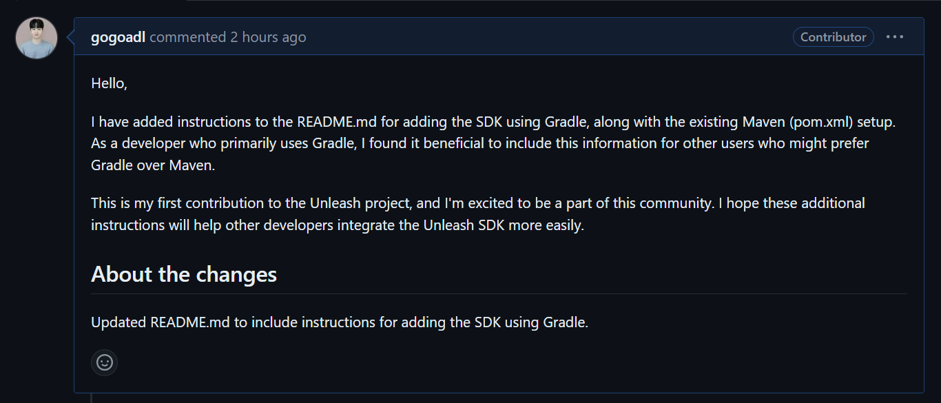 해당 서비스는 피쳐 플래깅 서비스의 Java측 SDK로, ReadMe에 해당 서비스를 사용하기 위한 설정들이 적혀 있었는데, Maven 프로젝트 기준으로 세팅하는 방법이 적혀 있었다. 나는 평소 Gradle로만 프로젝트를 진행했었고, 많은 주니어 개발자들이 비슷한 경험을 했을것이라고 생각했다. 따라서, Gradle로 SDK 의존성을 추가하는 간단한 ReadMe를 작성했다.