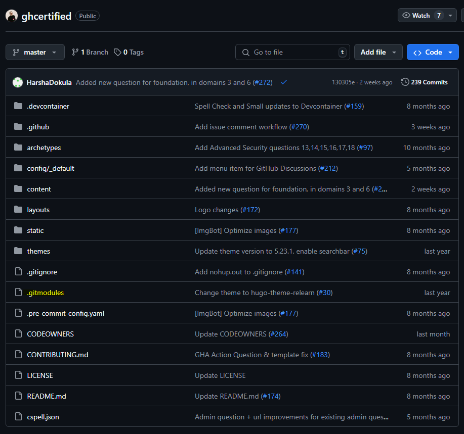 현재 기여를 준비하고 있는 gihub가 주관하는 자격증의 시험 문제 덤프 서비스인 ghcertified에서도 .gitmodules로 서브모듈을 관리하고 있다. (이미지에 노란색으로 표시했다.)