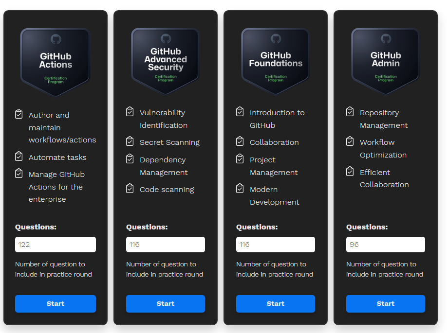 아무래도 자료가 없다보니 AWS 자격증을 준비했던 것처럼 편리한 덤프 사이트를 찾기가 어려웠다. 그 중 Github public Repository에서 ghcertified라는 서비스를 볼 수 있었다.