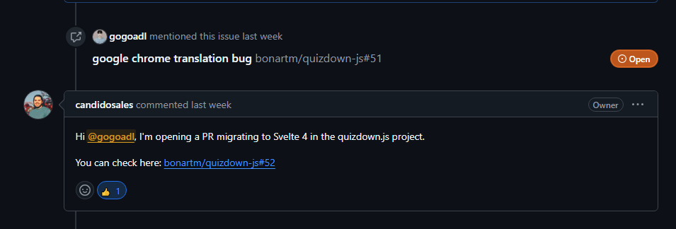 그런데 quizdown.js 라이브러리를 4버전으로 올리면 안되냐고 하셔서 제가 못나서 못합니다.. 라고 말씀드렸더니, 이분께서 직접 quizdown.js를 svelte 4 버전으로 마이그레이션 해주셨다!