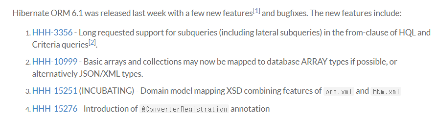 JPA의 한계라는 내용이었다. 많은 글에서 JPA는 From절 Subquery를 지원하지 않는다는 내용을 볼 수 있었고, 그 중 Hibernate 6.1 버전에서 Subquery에 관한 지원이 추가되었다는 사실을 알게 되었다.
