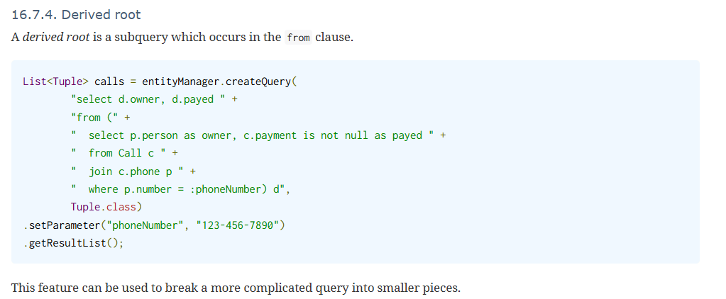 이 사실을 통해 hibernate 문서를 뒤졌고, from절에서 subquery를 사용하는 예제를 찾을 수 있었다.