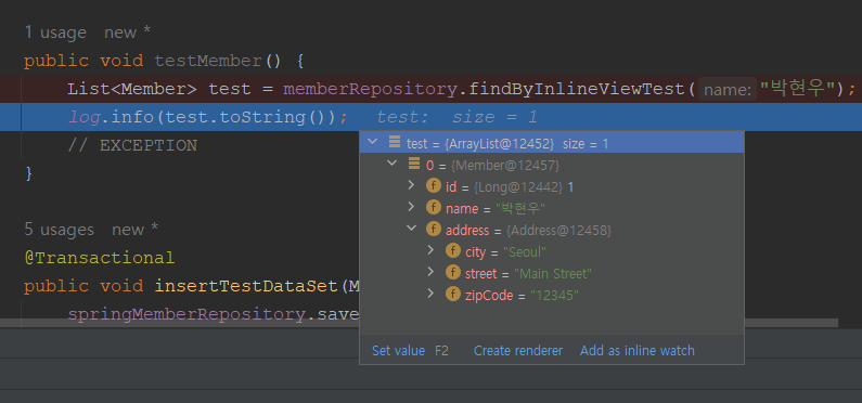 List<Member> test = springMemberRepository.findByInlineViewTest("박현우");