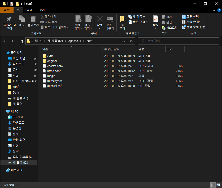 그 후 conf 폴더로 이동하여 httpd.conf 에서 몇가지 설정을 해준다.