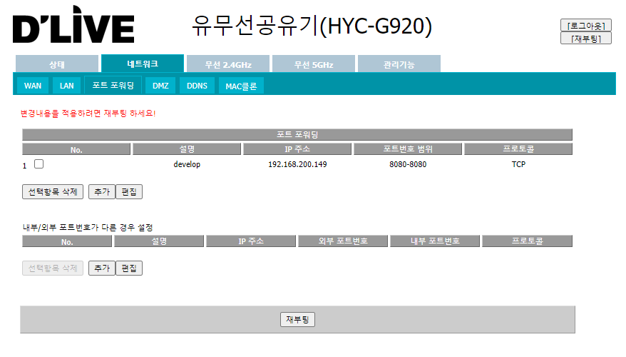 필자는 딜라이브 공유기를 사용하므로 딜라이브 공유기 환경설정 페이지로 이동하겠다.