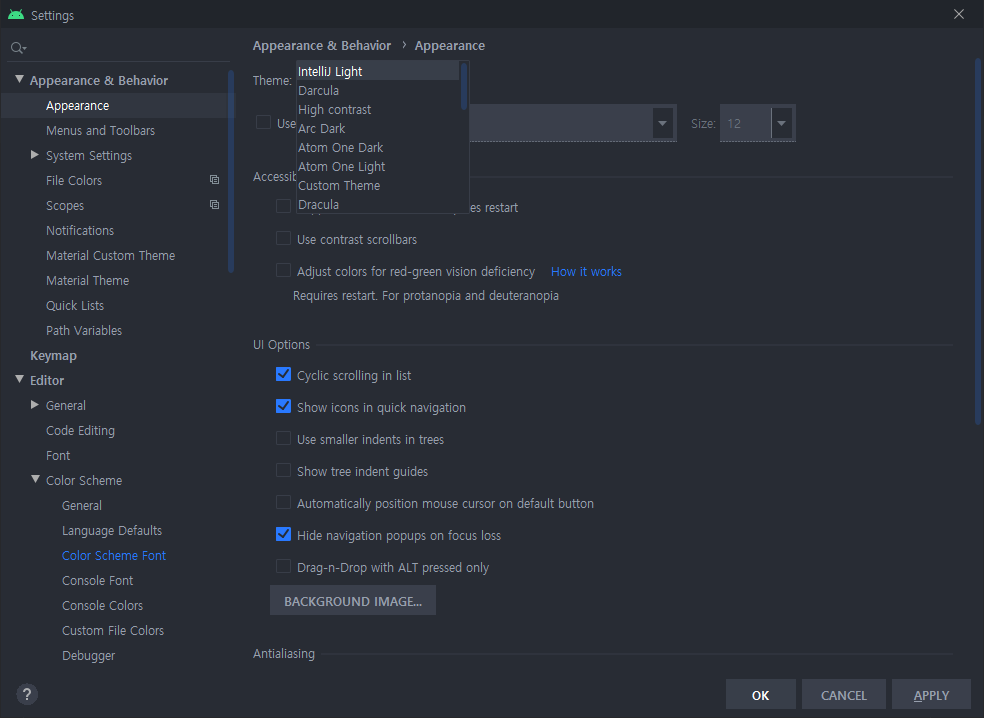 이 플러그인 설치 후 IDE를 재시작 하시면 위의 테마를 선택하는 부분에서 마음에 드는 테마를 선택하시면 됩니다.