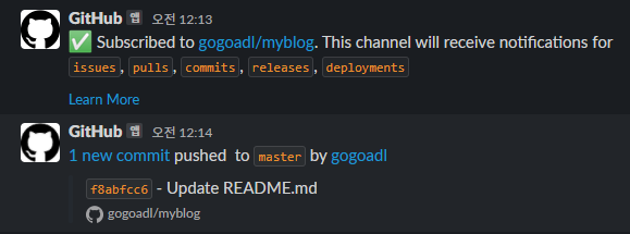 기본적으로 issues, pulls, commits, releases, deployments에 대한 알림을 github으로 전송해준다!