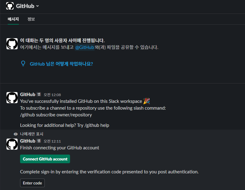 어쨌든 이까지 순탄하게 설정해주고 다시 Slack으로 돌아온 후 구독 할 레포지토리를 선택해주면 된다.