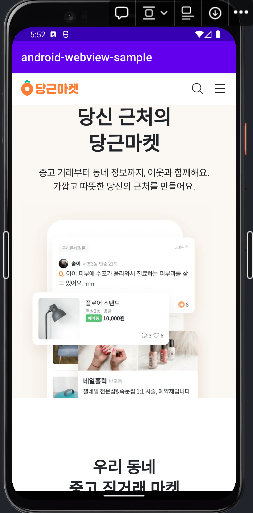 여기까지 설정 시 아래처럼 안드로이드 앱 실행 시 당근마켓의 홈 페이지를 표시합니다. 그러나 당웹뷰 내의 버튼을 클릭 시 앱 내에서 이동하지 않고 새로운 chrome 앱을 통해 페이지를 표시했습니다.