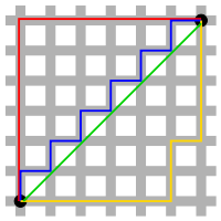 맨해튼 거리란 유클리드 거리와 함께 좌표간의 거리를 구하는 방식을 말하는데, 아래의 그림을 봤을 때 빨간색, 파란색, 노란색은 모두 12로 가장 짧은 맨하탄 거리이다. 초록색으로 직선 거리를 표현 한 것이 유클리드 거리이다.